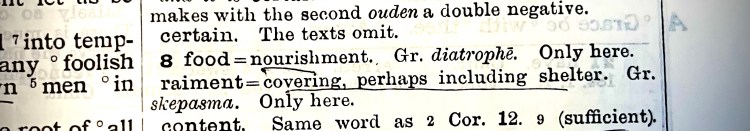 In our lifetimes we can be blessed by our Heavenly Father with the physical blessings He bestows upon us. Having food and raiment let us therewith be content. Bullinger here in verse 8 in the Companions Bible on page 1807 states that raiment is a covering and could also mean shelter.